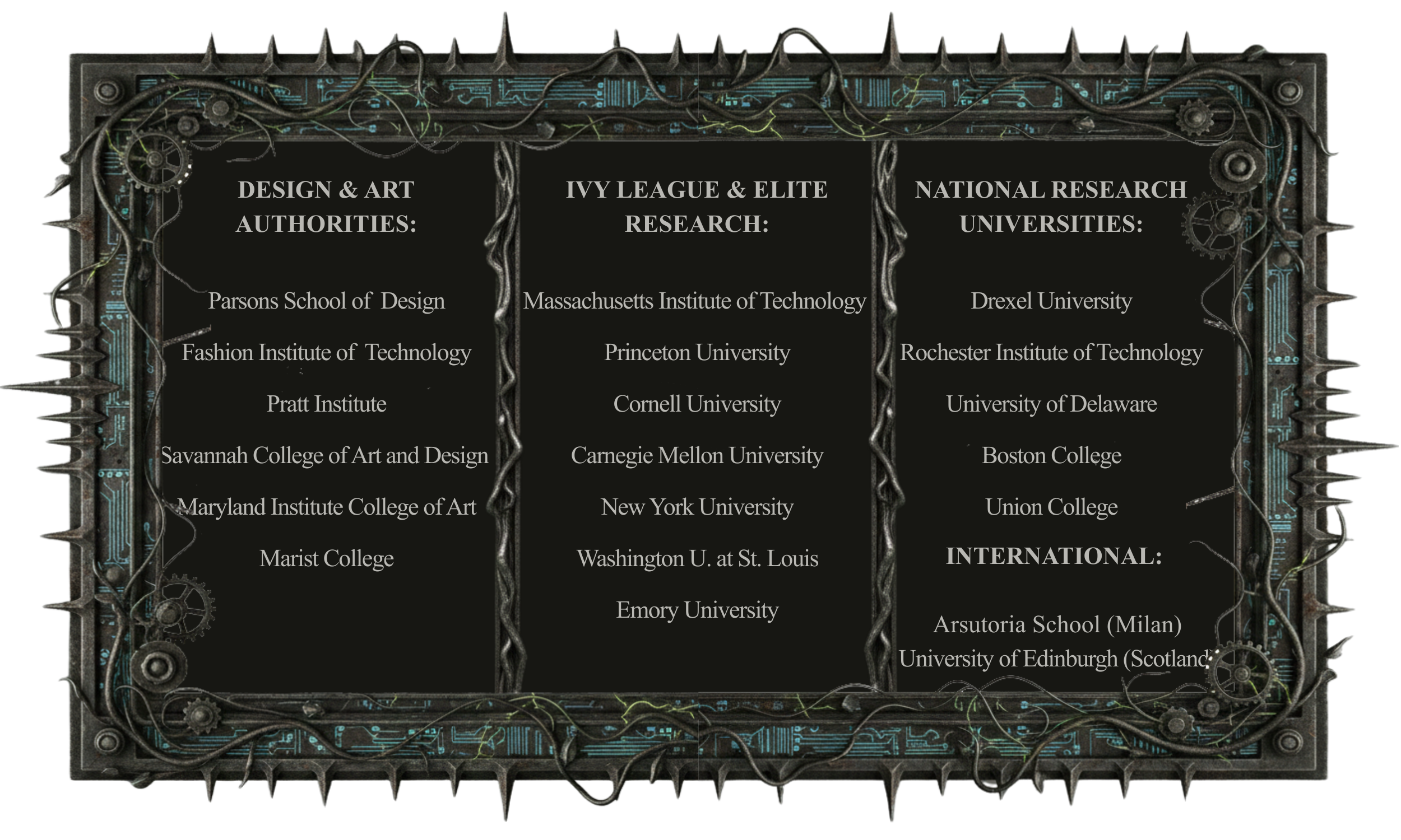 Where Our Apprentices Go Our students have achieved a 100% acceptance rate to their first-choice institutions. By mastering the laborious studio hours and internalization of technical engineering before college, they enter these prestigious programs with a significant competitive advantage.